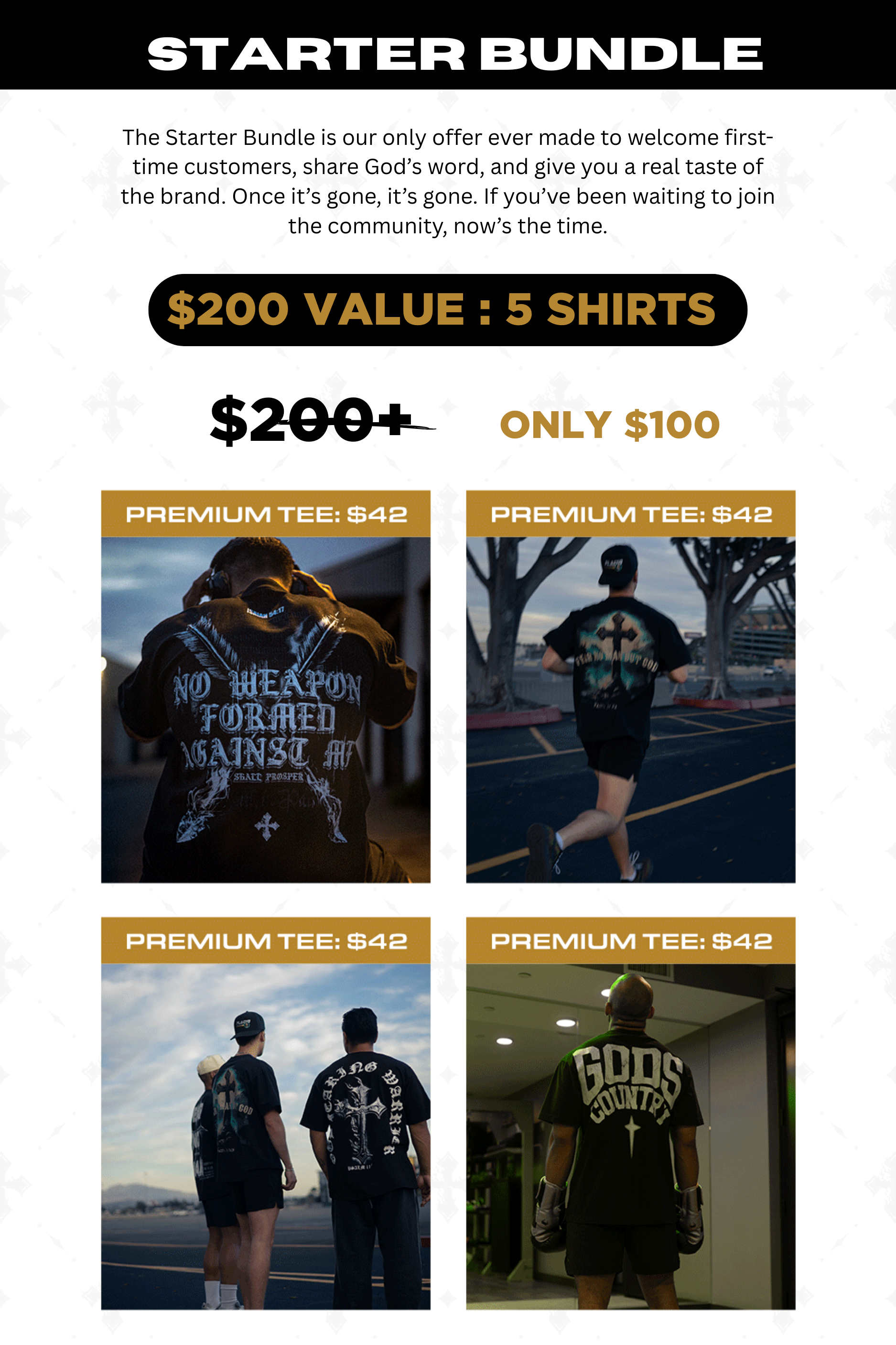 From the start, we wanted to create something bold, something real—a brand that represents faith with strength and conviction.But a message like this doesn’t spread on its own.It spreads through the people who believe in it.That’s why we created thislaunch bundleto give our early supporters a way to represent and help push this brand forward.